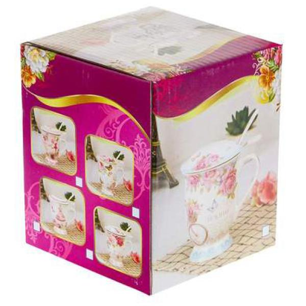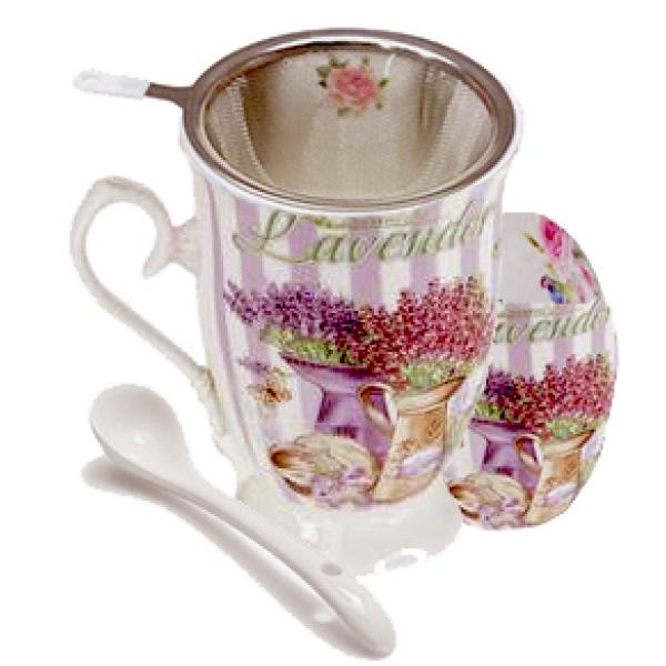 The gift cup "Lavender" has a metal tea strainer, a porcelain lid and a spoon. It is offered in a luxurious colored box.