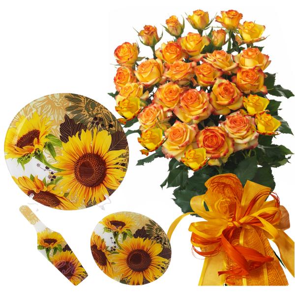 Букет от рози и Аксесоари за сервиране - Сервиз за торти от 8 части - Слънчогледово поле