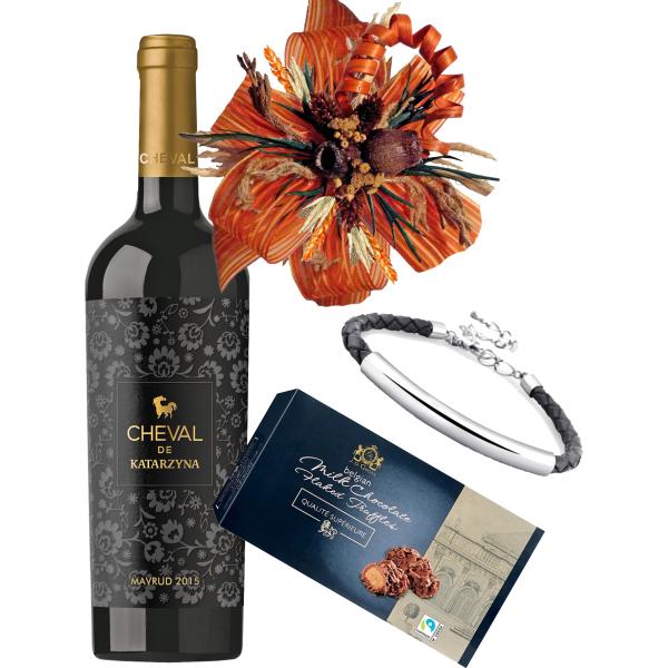 Мъжка кожена гривна, вино и бонбони - Комплект аксесоари