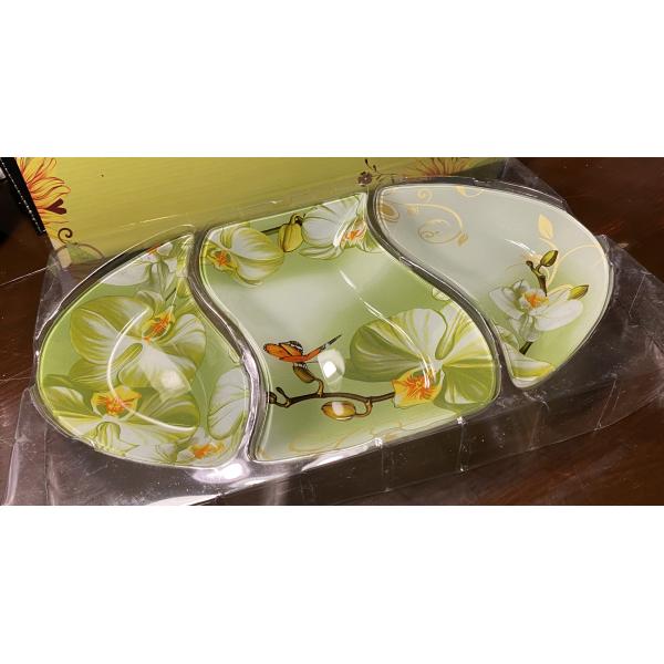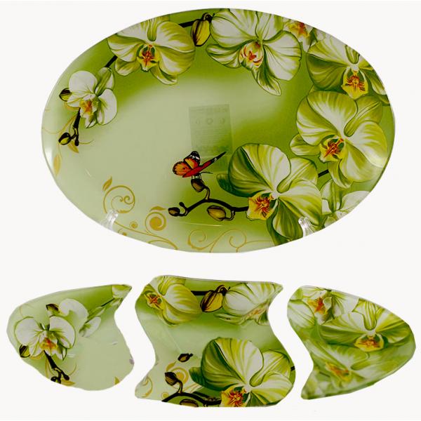 Платото е изработено от стъклен материал с красив принт на зелена орхидея. Стъкленото плато за сервиране се състои от четири части - едно голямо плато и три по-малки с интересен дизайн, което ще придаде уютна атмосфера на всяка празнична маса.