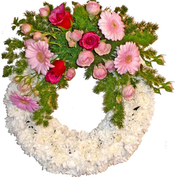 Траурният венец е изработен от свежи цветя като рози, гербери, хризантеми, в съчетание със зеленина, придаваща завършеност и изящество. Предлага се и с траурна картичка с персонализиран надпис по желание на клиента.